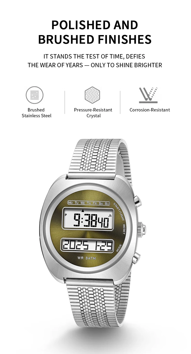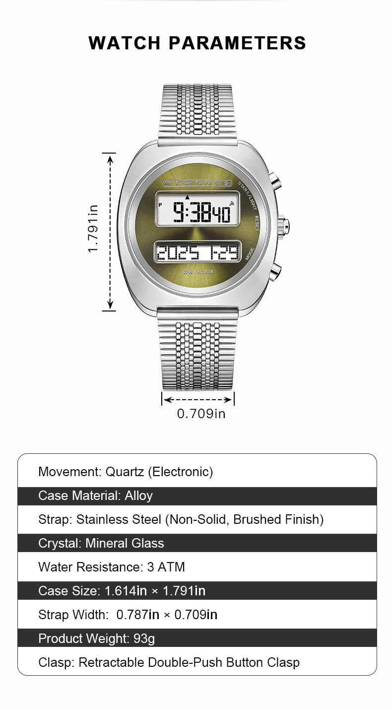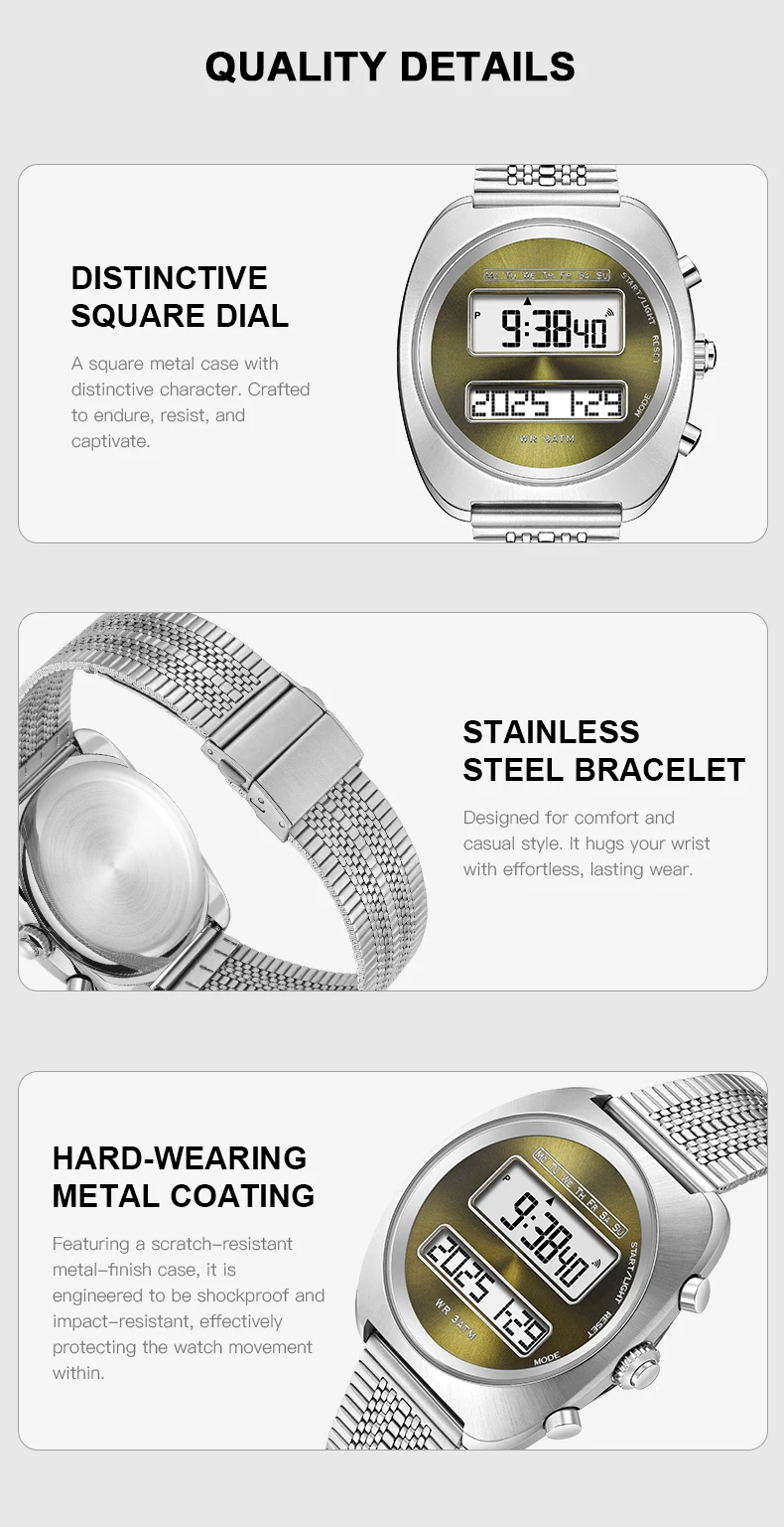Dual-Display Electronic Watch for Men Retro Style Digital Unisex Wristwatch with Stainless Steel Strap Month Date Year Backlight