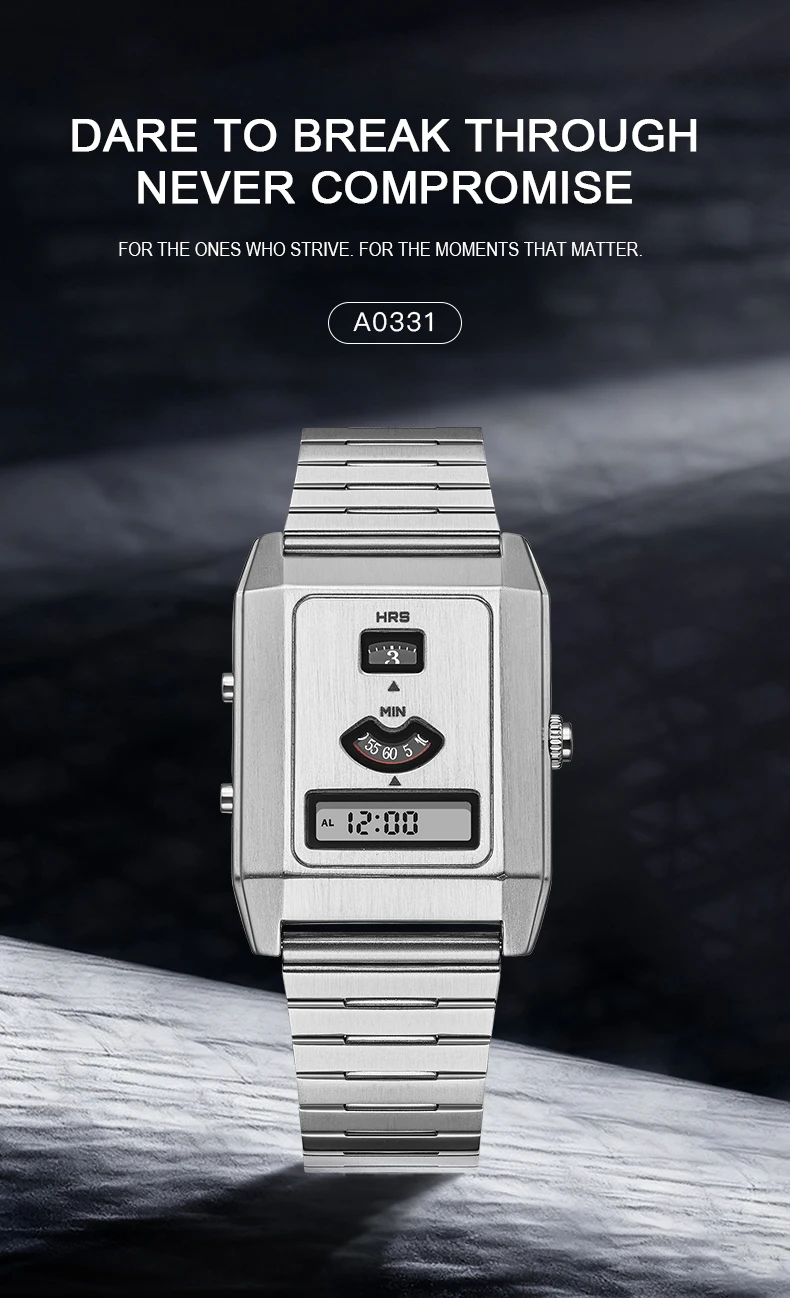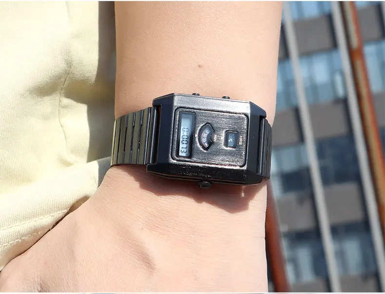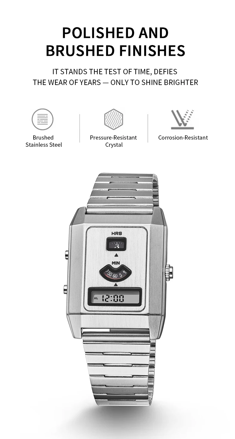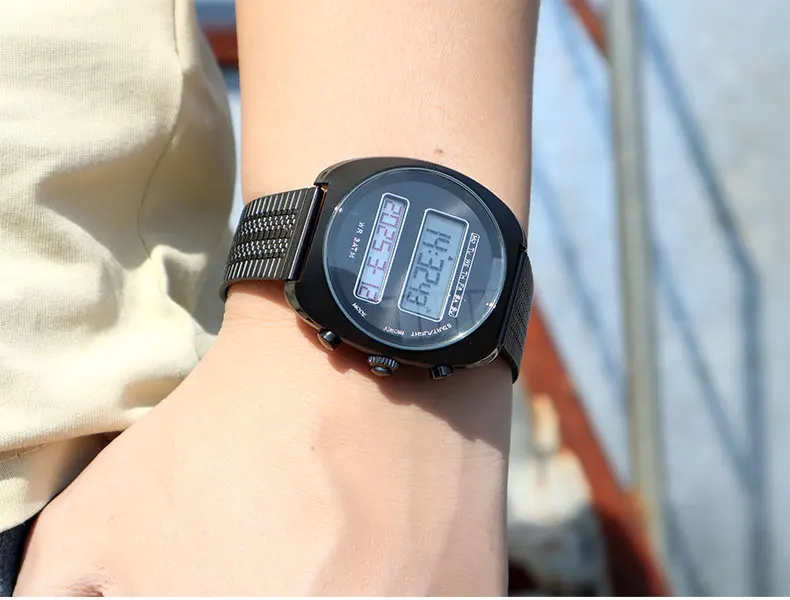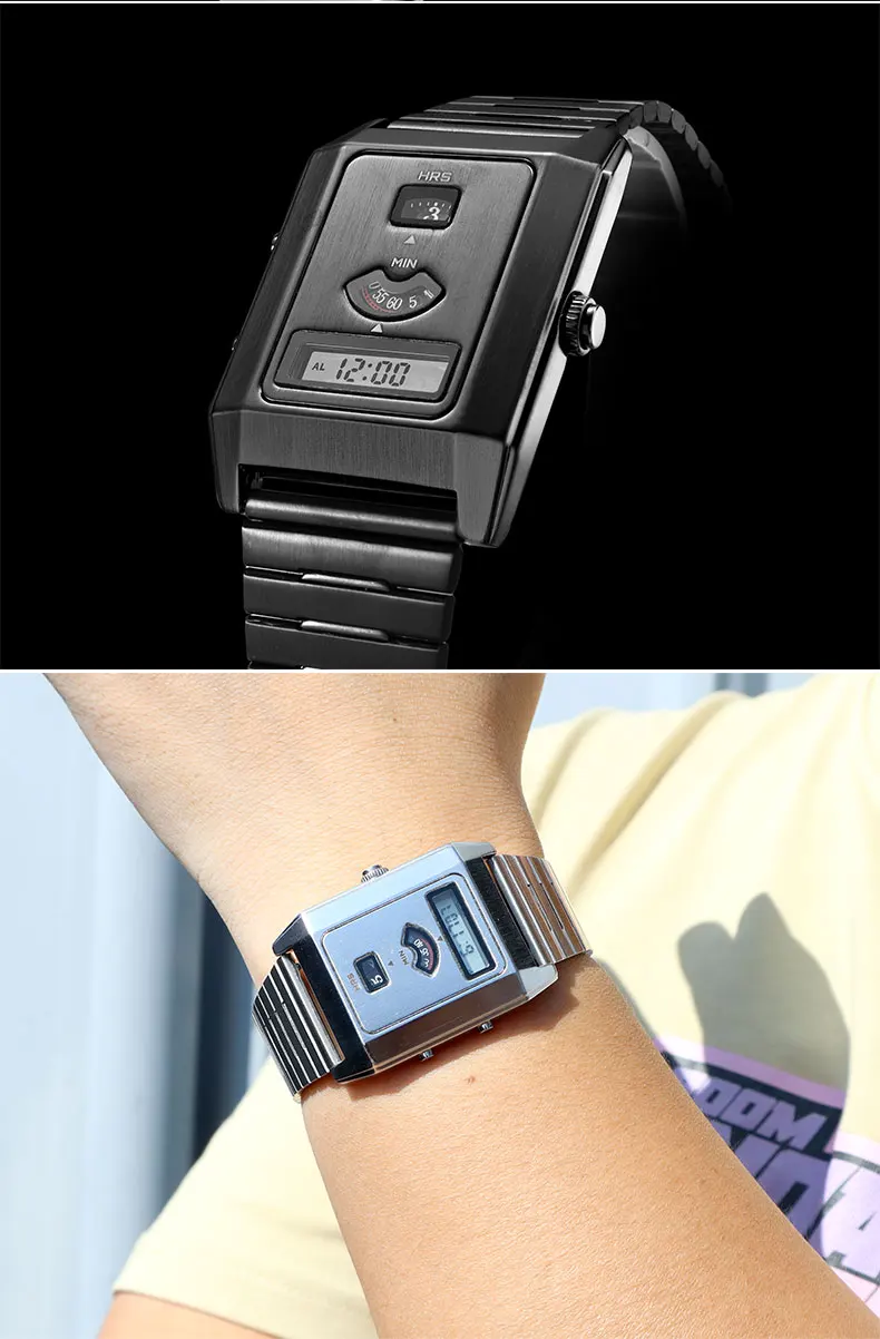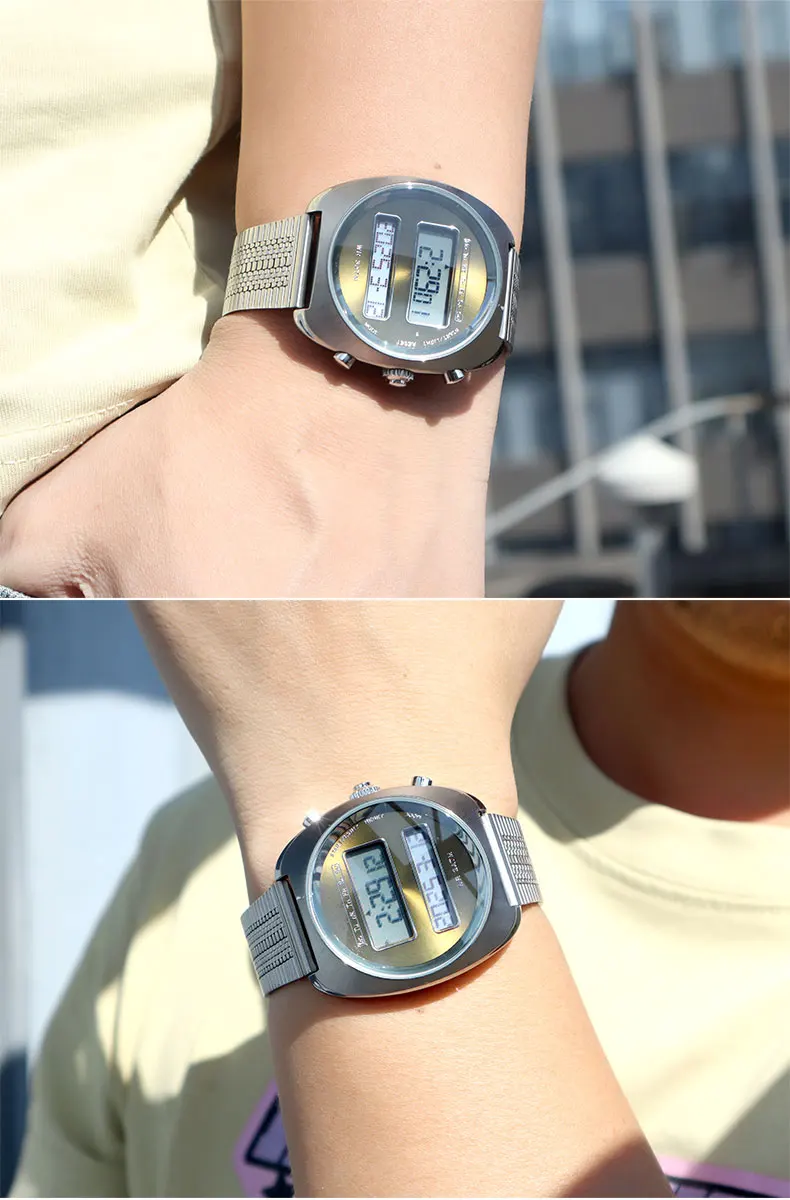 Fashion Quartz Electronic Dual Movement Men's Watch Tri-Display Backlight Alarm Unisex Wristwatch with Stainless Steel Strap